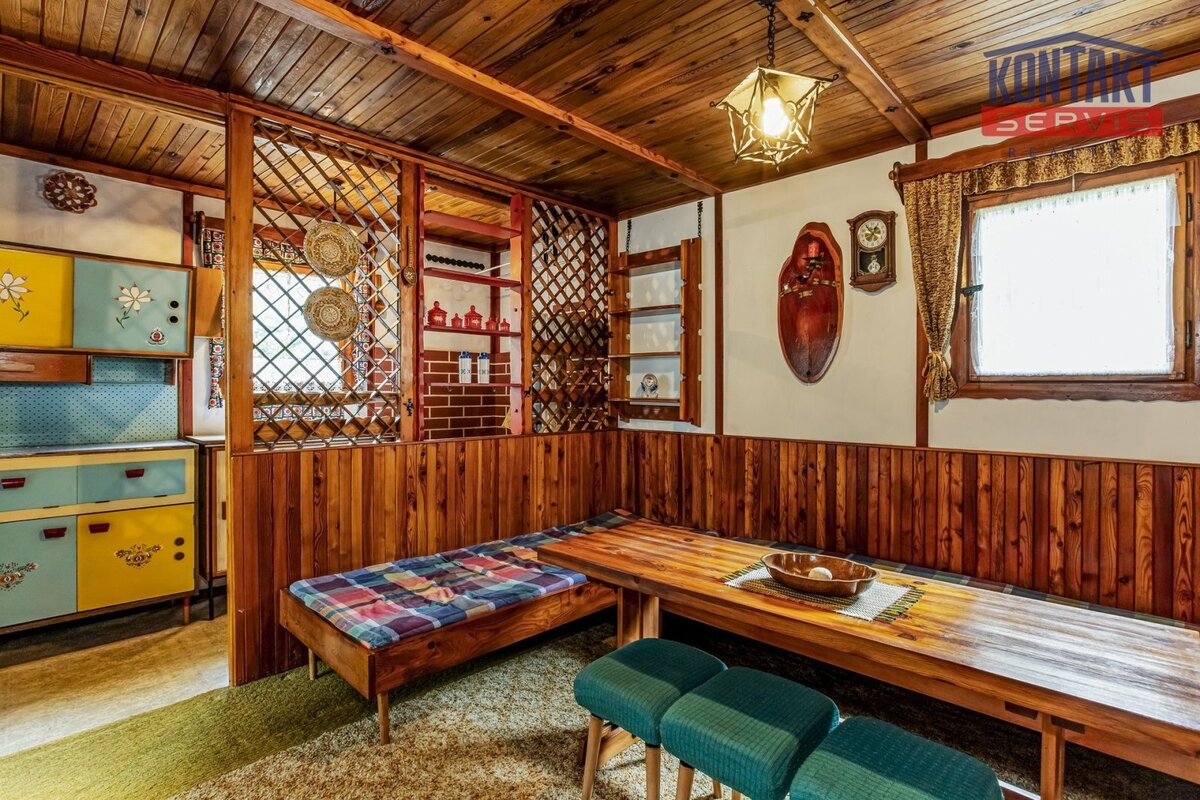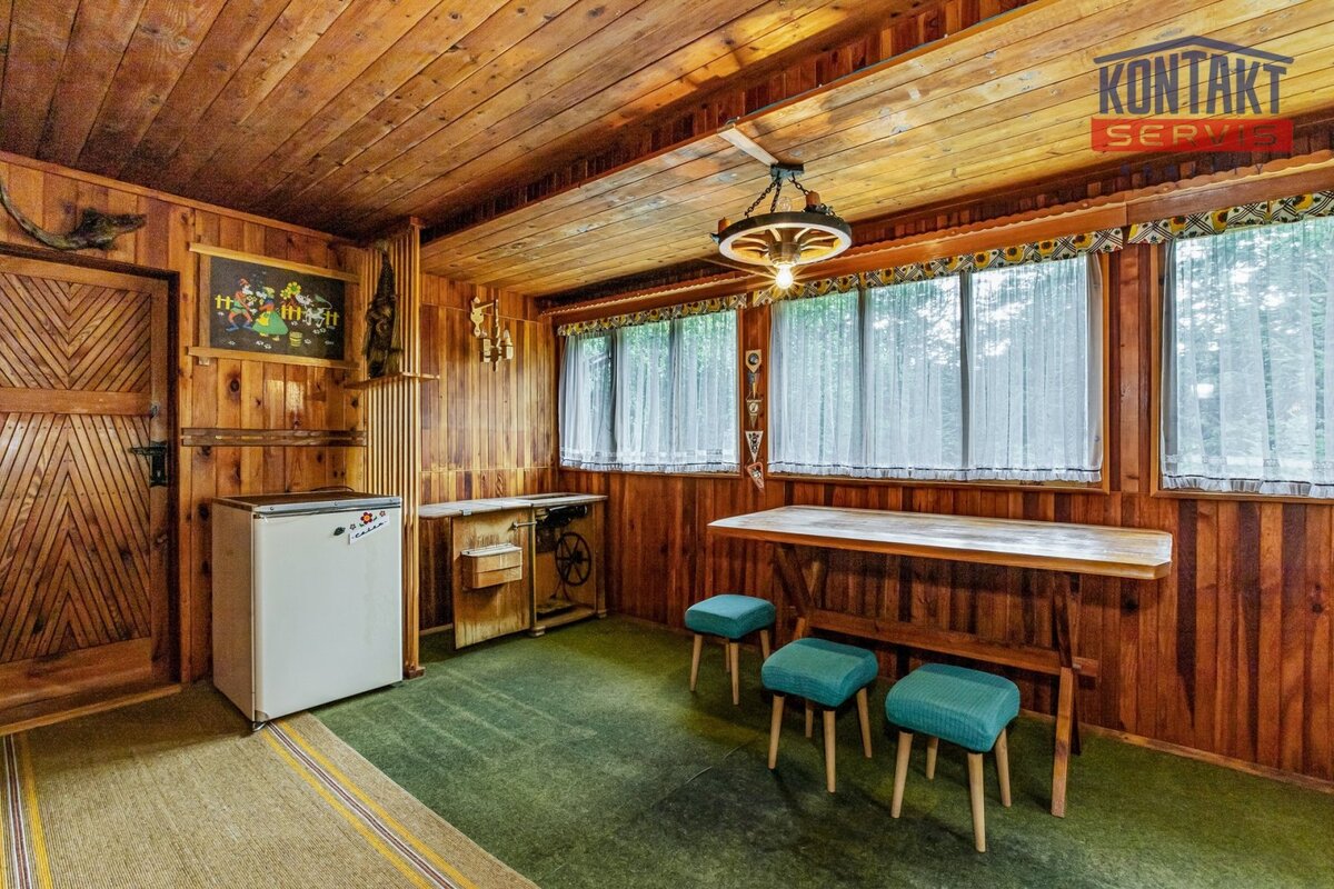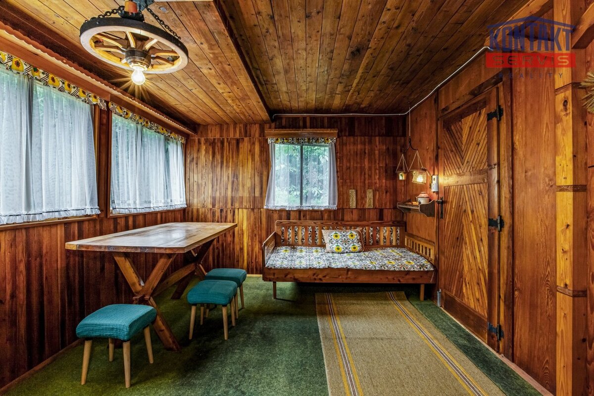 Interiér je laděn v tradičním chatařském stylu — barevný, funkční a s duší, což ocení především příznivci klasické rekreační estetiky.