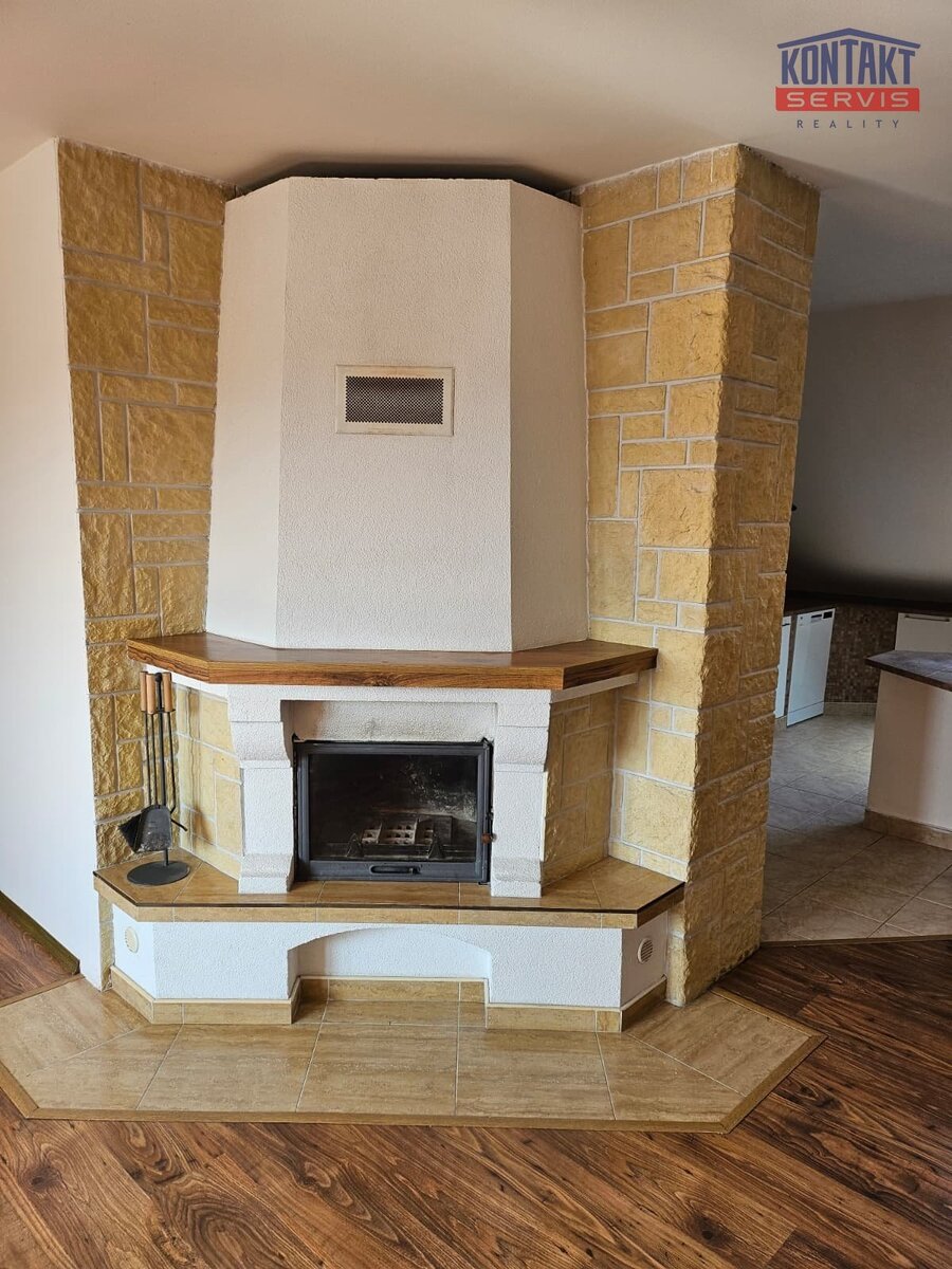 obývací pokoj s krbem propojený s rohovou kuchyňskou linkou a koupelnu